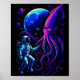 Funny Astronaut And Squid In Underwater Space With Full Moon