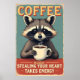 Cette adorable oeuvre d'art présente un raton laveur espiègle tenant une tasse de café avec l'expression ludique "Parce que voler les coeurs prend de l'énergie." Le design rétro et les couleurs chaudes font de cet imprimé un complément amusant et original à la cuisine, au bureau ou au café de tout amateur de café. Parfait pour les amateurs de raton laveur et de caféine, ce poster plein de charme ajoute une touche humoristique à votre décor. C’est un cadeau idéal pour toute personne qui aime le café, les animaux mignons et un petit humour dans sa vie.