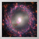 Galaxie spirale NGC 3351. Le gaz moléculaire dense est montré dans le magenta. De jeunes étoiles massives illuminent leur environnement en rouge. Les voies de poussière sont surlignées d'étoiles blanches et nouvellement formées en bleu.