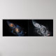 Galaxies IC 2163 et NGC 2207 (Hubble et Webb Images côte à côte) Voici deux vues de la même scène, chacune montrant deux galaxies spirales qui se chevauchent, IC 2163 à gauche et NGC 2207 à droite. L’observation de la lumière ultraviolette et visible du télescope spatial Hubble est à gauche et l’observation de la lumière infrarouge moyenne du télescope spatial James Webb est à droite. À l’image de Hubble, les bras en spirale remplis d’étoiles brillent en bleu, et les coeurs des galaxies en orange. Les deux galaxies sont recouvertes de couloirs de poussière brun foncé, ce qui obscurcit la vue du noyau de l’IC 2163 à gauche. À l’image de Webb, la poussière froide occupe le devant de la scène, jetant les bras des galaxies en blanc. Les zones où les étoiles sont encore profondément ancrées dans la poussière semblent roses. D'autres régions roses peuvent être des objets qui se trouvent bien derrière ces galaxies, y compris des trous noirs supermassifs actifs appelés quasars. Tournez votre oeil vers le bas à droite de l'image Webb. La région rose la plus grande et la plus brillante qui éclaire avec huit pointes de diffraction importantes est une mini starburst — un endroit où de nombreuses étoiles se forment en succession rapide. La même région dans l'image de Hubble apparaît comme un amas d'étoiles bleu vif. Les trous de dentelle dans les bras en spirale blanche des images de Webb sont souvent là où les supernovae ont explosé il y a longtemps. Dans les mêmes régions, Hubble montre que ces zones sont maintenant peuplées d'étoiles plus récentes. Les zones noires situées en haut à droite et en bas à gauche de l'image Hubble ne contiennent aucune donnée. NASA, ESA, CSA, STScI https://webbtelescope.org/contents/media/images/2024/136/01J9S5P7D668XGRWBNA950CSB2?