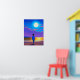 Affiche illustrant un jeune garçon sur la plage la nuit, regardant une pleine lune et un ciel étoilé