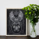 Une puissante chouette ailée s'envole au-dessus d'un crâne orné de clés. Le hibou est encadré par des motifs tourbillonnants et complexes, des chaînes et une croix celtique. La palette de couleurs monochromatiques ajoute à l'atmosphère dramatique de l'image.