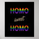 Poster doux et drôle, avec le texte décoratif "HOMO doux HOMO", un mot par ligne. La première et la dernière montre des lettres majuscules pleines d'un symbole gay, le drapeau arc-en-ciel. Le "sucré" centré est légèrement incliné et peut être ajusté en couleur. Vous pouvez également customiser la couleur arrière - plan solide.