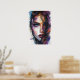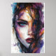 Ce magnifique mur d'art présente un portrait d'aquarelle saisissant d'une femme dont les yeux bleus perçants attirent l'attention. L'oeuvre mêle des coups de pinceau audacieux à des éclaboussures de couleurs vives (violets profonds, oranges enflammées, bleus cool et dorures chaudes), créant un sens dynamique du mouvement et de l'émotion. De fines lignes ressemblant à de l'encre se tissent à travers ses cheveux, ajoutant profondeur et texture, tandis que ses lèvres pourries et son regard intense évoquent mystère et force. Parfait pour les intérieurs modernes, les amateurs d'art et toute personne attirée par des portraits puissants et expressifs, cette oeuvre fait un point focal dramatique dans n'importe quel espace.