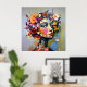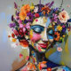 "Géométrie Florale" - Un Portrait Botanique. Une rencontre complexe de design en mosaïque angulaire et d'abondance florale luxuriante définit ce travail. Le regard perçant de la femme contraste avec la douceur des fleurs, créant un équilibre entre précision et chaos. Une palette vif de roses, jaunes, violets et rouges met en évidence le lien entre la structure et l'organique, donnant un portrait moderne et inoubliable.