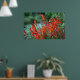 Une photo de fleurs de gladiolus flambant de couleur. Des fleurs rouges-orangées aux accents jaunes recouvrent les tiges des plantes. La faible profondeur de champ donne à l'arrière - plan vert un aspect peintre. 35 mm, couleur.