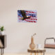Image magnifiquement patriotique d'un oiseau américain de l'aigle à tête blanche qui survole des montagnes enneigées, sur un drapeau américain agitant bordé de neige et de glace gelées. La photo du drapeau gelé a été prise par le photographe observateur aux yeux pointus, Rob Boyer.