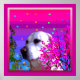 Les différentes nuances de bleu, de violente, de lavande et de violet sont un cadre parfait pour ce magnifique Labrador qui regarde paisiblement de l'intérieur d'un arbuste fuschia brillant.