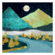 Un magnifique paysage avec des textures uniques montrant un paysage de rivière et de montagne avec une lune montante et ciel étoilé dans les tons de bleu, or, vert foncé et jaune.