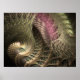 Fractal art showing la feathered golden spiral on black background and pink and green details.