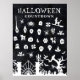 Affiche de compte à rebours d'Halloween. L'exemple est un grand modèle de 76x102 cm avec 31 jours calendaires que vous pouvez barrer ou marquer à mesure que chaque jour passe en octobre. Comprend différentes illustrations, notamment des araignées, des crânes, des chats, des balais de sorcière, des potions, des bougies, des chauves-souris, des chaudrons, des fantômes, un cimetière et un arbre effrayant avec un visage.