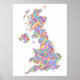 Une carte texte typographique de la Grande-Bretagne montrant plus de 500 villes au Royaume-Uni, texte multicolore sur un arrière - plan blanc.