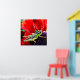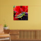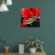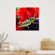 Cette affiche aux couleurs brillantes présente une sauterelle verte, jaune et noire brillante perchée sur le centre violet d'une fleur aux pétales rouges magnifiques.