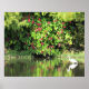 Pic of a Great Egret fishing in a Florida Swamp with beautiful flowered bush in the background