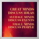 Great Minds Discuter des idées Moyenne des esprits Discuter des événements Petits esprits Discuter des gens Le Modèle utilise 4800x4800px, peut re-dimensionner en une taille et un prix plus petits, il suffit de choisir les options de taille Soit vous cherchez des citations inspirantes pour la motivation du personnel, ou juste des citations motivationnelles, un message inspirant pour stimuler la motivation c'est la voie à suivre. Le magasin est rempli d'affiches de citations inspirantes et ce n'est pas seulement une affiche, il y a ipad, iphone, manches d'ordinateur portable pour motiver tout autour soit pour votre personnel ou juste vous comme une personne géniale qui cherche des motivations.