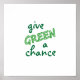 Des affiches "donne une chance à GREEN" sont créées pour la personne qui est soucieuse de l'environnement et qui souhaite diffuser le message pour rappeler aux autres la situation désastreuse de notre planète. Les images des feuilles forment le mot VERT. Il y a aussi la possibilité de choisir le type et la taille de papier de votre affiche.