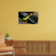 Grenouille à chaux acrobatique vert avec rayures orange et noir sur le ventre, on dirait qu’il fait un stand à main. Amphibien bondissant très coloré sur un arrière - plan noir et blanc.