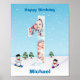 Belle illustration enneigée sur le thème du pays des merveilles hivernales. Créez un premier collage photo d'anniversaire dans une grande forme numéro un. Remplacez l'exemple d'images par vos propres images. Décoré avec un beau paysage hivernal, glaces, neige et bonhomme de neige sur snowboard. Grand cadeau 1er anniversaire. Collage photo personnalisé numéro 1 pour un produit unique et très spécial.