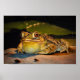 Gros plan photo macro d'un gros crapaud vert et jaune sur un tabouret dans un étang sur le point de croquer