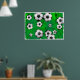 Illustration d'un grand nombre de balles de football qui tournent autour d'un arrière - plan vert teinté et texturé. Image disponible sur divers cadeaux et produits.
