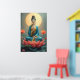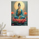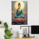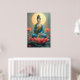 Le tableau représente Guanyin méditant sur un lotus rose en fleurs, son visage calme et serein aux yeux mi-fermés. Elle porte une élégante robe azurée parée d'or, symbolisant la pureté et la grâce. Derrière elle se trouve un halo brillant, qui renforce son aura divine de paix. Elle est entourée de fleurs de lotus délicates dans des tons doux et harmonieux, créant une atmosphère de tranquillité. L'angle face à face et le style de peinture détaillé et doux captent sa présence paisible et royale.