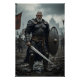 Un tableau numérique hyper détaillé et cinématographique d'un formidable guerrier européen du 12ème siècle, prêt à se battre sur un champ de bataille boueux et tourmenté. Il a un physique musclé et puissant, un visage sévère et patiné avec un regard concentré, et des cheveux et barbe argentés ou blancs indiquant un vétéran chevronné. Vêtu d'une armure authentique du 12e siècle, notamment d'un chariot de courrier rivé au-dessus d'un gambeson rembourré, de boîtes aux lettres, de bottes en cuir robustes et peut-être d'une hélime conique nasale ou de casserole, il échappe à l'autorité et à la disponibilité. Une ceinture en cuir solide tient des barbes à langes ou des poches. D'une part, il s'attaque à une épée viking à double tranchant bien entretenue, large et de style normand, avec un pommeau à plusieurs lobes bien en vue, d'autre part, un grand bouclier de cerf-volant avec un dispositif simple. L'arrière - plan montre des bannières en lambeaux, de la fumée lointaine et des silhouettes de fortifications assiégées sous un ciel sombre et couvert. L'éclairage dramatique accentue les textures de métal, de boue et de tissu usés, créant une atmosphère de détermination sombre, d'anticipation et de réalisme médiéval brutal.