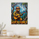 Cette charmante oeuvre présente un ours habillé comme pompier, avec casque et lunettes de soleil, jouant d'une guitare acoustique, perché sur une branche d'arbre robuste dans une forêt luxuriante. Un pot de miel est suspendu à une branche supérieure au-dessus de lui. L'arrière - plan présente de grands arbres et du feuillage dans une forêt doucement éclairée. Le tableau utilise des coups de pinceau épais et texturés, donnant une sensation de fantaisie et de coeur, avec "Love My Honey" écrit ci-dessous.