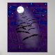 L'heure de l'envoûtement approche, éffrayant plaisir avec les chauves-souris, une pleine lune blanche, étoiles et silhouettes d'arbre sur cette affiche.