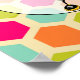 Une abeille au miel joyeuse avec son boule de miel debout dans un cercle transparent avec une bordure noire. Arrière - plan cool en forme de ruche hexagonale aux couleurs vintages de rose, bleu, orange et vert.
