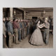 A woman in a patterned dress dances with an older man in a rustic wooden hall. Men in work attire line the walls, watching the scene. The women where brought over to the western saloons from other countries to dance with the men folk for a fee in the 1800's
