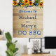 Cette affiche rustique I DO BBQ fiançailles bienvenue est parfaite pour accueillir les invités à votre BBQ fiançailles. Cette grange à thème amusant est décorée de bois clair avec une rangée de jolis tournesols boho et des plumes bleues suspendues au sommet. Personnalisez avec des prénoms pour une belle ambiance rustique. D'autres polices et couleurs sont disponibles.