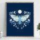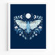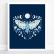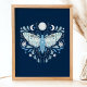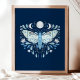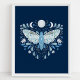 Poster d'illustration moderne bleu et blanc Abstrait de la teigne céleste. Ce dessin magique mystique abstrait de saumons comporte une belle illustration complexe de papillon de nuit avec une pleine lune et des phases de lune croissant. Orné de fleurs sauvages, et de fleurs florales. Esthétique sorcière bohème.