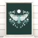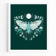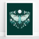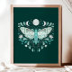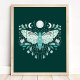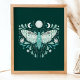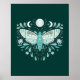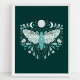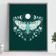Poster d'illustration moderne Turquoise Et Blanc Abstrait Céleste. Ce dessin magique mystique abstrait de saumons comporte une belle illustration complexe de papillon de nuit avec une pleine lune et des phases de lune croissant. Orné de fleurs sauvages, et de fleurs florales. Esthétique sorcière bohème.