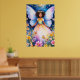 Affiche d'une jeune fille aux ailes de papillon dans un jardin animé, entourée de fleurs colorées et d'étoiles brillantes. Sa robe est multicolore, et elle porte une couronne de fleurs dans ses cheveux bouclés.