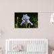 Joli périwinkle iris avec centre blanc et barbe jaune et bourgeons prêts à ouvrir dans l'arrière - plan. Des gouttes de pluie sur des pétales délicats. Les arbustes verts sont floues au loin. Photographie originale © TamiraZDesigns.