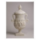 This image displays an elegant white marble Ace of Coppe (cups) featuring a sculpted face, decorative fluting, and ornate handles, resting on a square pedestal.