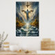 Jacques 2:19 Vous croyez que Dieu est un, vous faites bien. Même les démons croient - et frissonnent la scène majestueuse où une figure, probablement représentant Jésus-Christ, est élevée au-dessus d'une mer turbulente avec des bras tendus. Il est enveloppé d'une lumière éclatante, avec une croix derrière lui qui semble être faite de bois et a des épines attachées. Le ciel ci-dessus est un mélange d'oranges et de bleus, suggérant soit un lever de soleil, soit un coucher de soleil. De part et d'autre de la mer, il y a des chaînes de montagnes accidentées, et les eaux elles-mêmes sont tumultueuses avec des vagues qui s'écrasent contre les rochers.