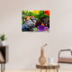 Cette affiche colorée présente un pot bleu qui s'est posé sur une terrasse de porche entourée de fleurs. La couleur bleue, grise, blanche et noire de l'oiseau est déclenchée par une émeute de couleur. On y trouve une théière décorative aux nasturtiums orange et jaune et une pétunia violette. Les feuilles verts complètent ce kaléidoscope de couleurs.