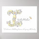Jolie affiche de prénom personnalisé avec monogramme, parfaite pour la chambre ou la salle de jeux d'une fille dans des tons de gris, blanc, jaune, rose et violet. Personnalisez avec le nom de votre enfant commençant par I, et la signification du nom pour un cadeau unique et vraiment personnalisé pour la chambre ou la nurserie de votre enfant, cet exemple est pour le nom I Iuana vent sur un ruisseau bouillonnant, intrigant avec beauté. Impression d'affiche mignonne idéale pour un nouveau-né, un cadeau de baptême ou de baby shower. © Monogramme unique lettre I avec coeurs et fleurs dessin et conception graphique par Sarah Trett. www.sarahtrett.com pour www.mylittleeden.com