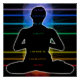 Une pose de yoga avec les affirmations de chakra : Je suis en sécurité, Je suis magnifique, Je suis digne, Je suis amoureux, Je suis ouvert, Je suis réveillé, Je suis léger sur les emplacements chakra avec les couleurs chakra derrière.