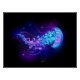 Grande méduse bleue, artistiquement dessinée, brillante, brillante, avec de longues tentacules sur arrière - plan noir avec bioluminescence violette. Méduse brillante.
