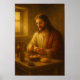 This peaceful artwork shows Jesus breaking bread at a humble wooden table, bathed in soft golden sunlight. The warm colors and gentle atmosphere create a comforting, inspiring piece perfect for home or devotional spaces.