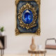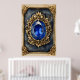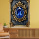 A jewel adorned with a large blue gemstone, likely a sapphire or tanzanite, set in a detailed gilt Baroque-style frame.