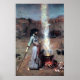 Une sorcière dessine un cercle magique enflammé sur la terre pour créer un espace rituel tel que peint par John William Waterhouse.