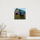 Joli cheval noir devant une vieille grange rustique entourée d'un poster de tournesol.
