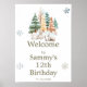 Poster rustique d'anniversaire de naissance avec de mignons lapins lapins, des arbres et des flocons de neige. Parfait pour un anniversaire d'hiver. Les mots peuvent être changés en fonction de vos propres détails ou exigences