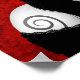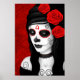 Ce design unique présente une belle femme aux roses rouges dans les cheveux. Son visage est décoré dans le style des crânes de sucre du Jour des Morts qui comprend des lignes tourbillonnantes, une bouche cousue et un nez noir. De grands cercles noirs, entourés de petites pédales de fleurs rondes, apparaissent autour des yeux de la fille et un petit coeur renversé se trouve au milieu de son front. Les cheveux noirs à jet de la femme tombent sous ses épaules et se fondent dans sa robe de dentelle noire. Cet élégant motif est un bel exemple de ce Jour des Morts.