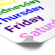 Un outil d'apprentissage pour enseigner les jours de la semaine. De l'autre côté du haut se trouve le titre : Jours de la semaine (imprimé en noir). Chaque jour de la semaine : dimanche imprimé en rouge; lundi imprimé en orange; mardi imprimé en jaune; mercredi imprimé en vert; jeudi imprimé en bleu; vendredi imprimé en indigo et samedi imprimé en violet.