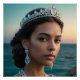 Portrait numérique ultra-réaliste d'une jeune femme en vue de trois quarts, éclairé par un éclairage dramatique chaud et cool. Elle porte un ensemble de bijoux en argent poli élaboré d'inspiration océanique, orné de bouquets de pierre turquoise, aquamarine et lune, dont une tiare, de longues boucles d'oreilles et un collier superposé. Sa robe turquoise s'harmonise avec le crépuscule marin doux et flou de l'arrière - plan, créant une élégance côtière sereine et luxueuse.