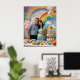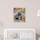 Cette peinture murale pleine de charme capture une scène de baby shower joyeuse avec une femme enceinte joyeuse et son mari debout près d'une table joliment décorée remplie de gâteries et cadeaux aux couleurs pastel. Elles sont entourées de nuages doux, de fleurs délicates et d'étoiles douces, dans un décor plein de vie avec arc-en-ciel et soleil. La future mère, souriante et tenant un petit ours en peluche, rayonne de bonheur alors qu'elle se tient près de son mari qui la soutient. L'effet aquarelle et les tons pastel doux créent une atmosphère chaleureuse et accueillante, avec une touche de fantaisie, ce qui en fait une pièce idéale pour la décoration de pépinière ou un cadeau spécial célébrant la parentalité.